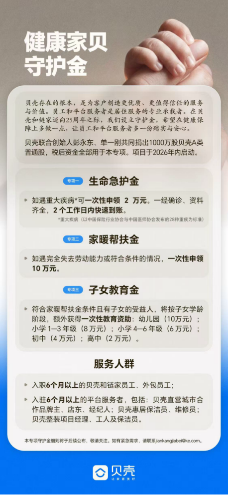 “平台存在的根本,是为客户提供更优质、更值得信任的服务与价值。员工和服务者是创造客户居住服务价值重要的专业承载者,”贝壳集团董事长彭永东在信中表示,“我和单总共同设立‘健康家贝守护金’,就是希望能多做一点,多保障一点,让服务者既能守护好小家,也能服务好千千万万个家,在一起奋斗的路上多一份踏实与安心。”