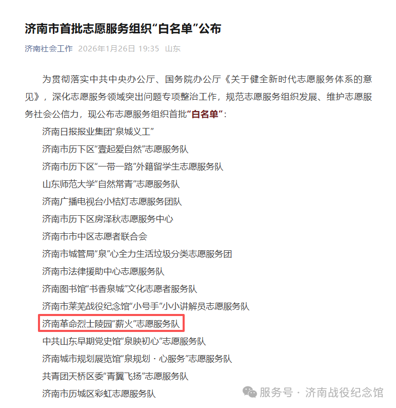 济南革命烈士陵园“薪火”志愿服务队入选市级“白名单”