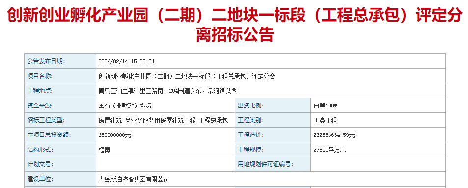 近日,创新创业孵化产业园(二期)二地块一标段(工程总承包)评定分离招标公告发布,工程地点位于黄岛区泊里镇泊里三路南,204国道以东,常河路以西,总投资6.5亿元,建设单位为青岛新泊控股集团有限公司。