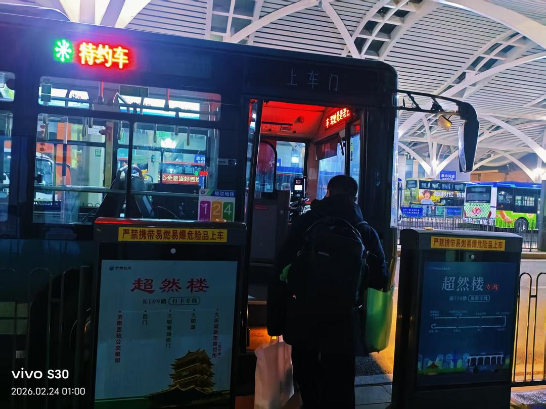 随着春节假期结束,济南西站迎来返程客流高峰,连日来多趟临时旅客列车凌晨抵站。济南公交西部分公司严格践行集团“高铁不到站,公交不收车”的服务承诺,通宵坚守、精准调度,为深夜返程旅客筑牢出行保障线。