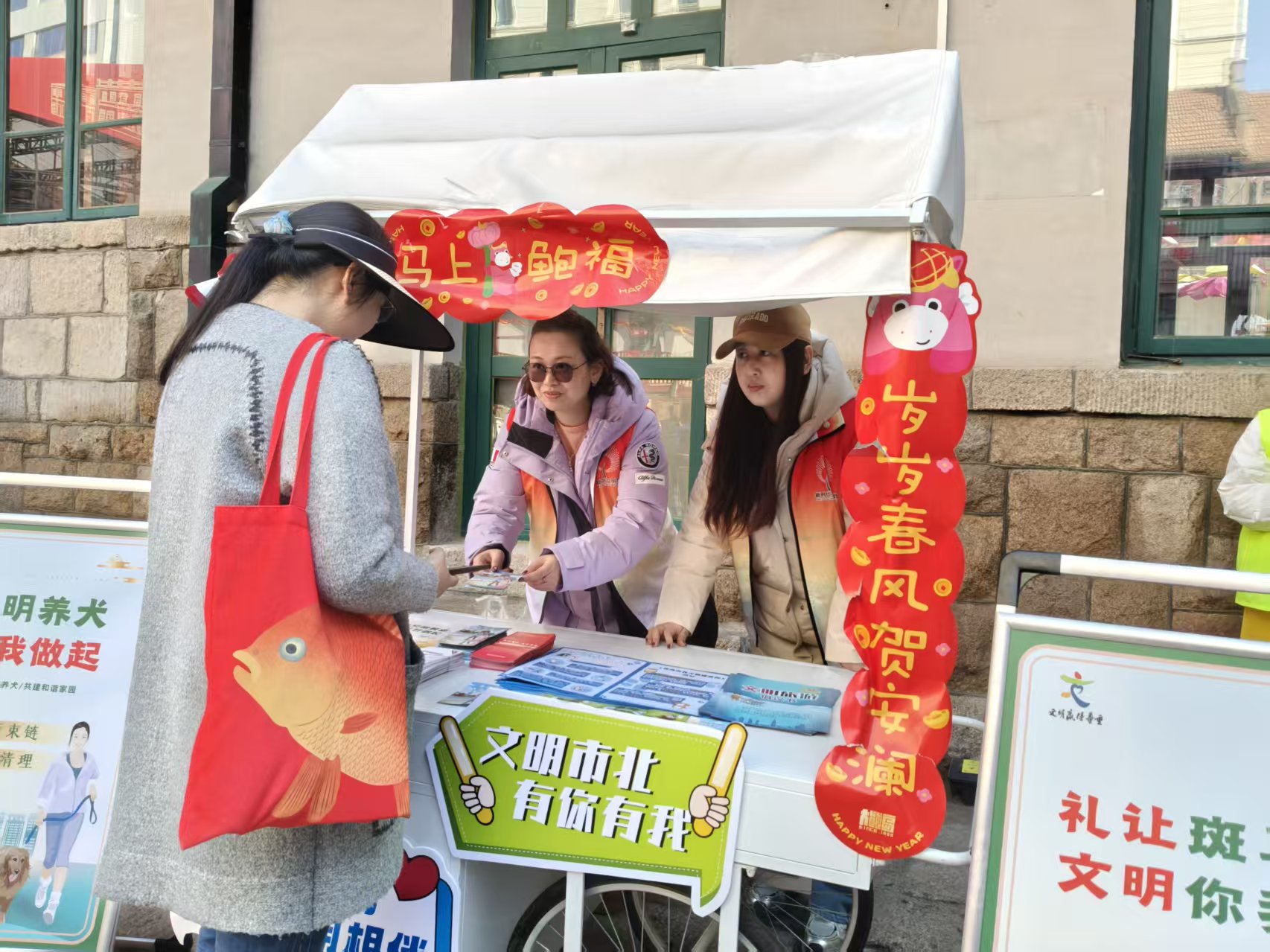 文明市北,你我同行。一抹志愿红,温暖一座城。截至正月初四,文明实践志愿者累计发放宣传资料1000余份,为1500余名游客提供文明引导志愿服务,让新时代文明新风浸润街区,充分展现青岛良好形象。接下来,市北区将继续组织即墨路、大港、辽宁路、延安路等街道文明实践志愿者,弘扬志愿精神,深化文明实践,用情用力保障节会圆满举办,广泛倡导新时代文明新风。