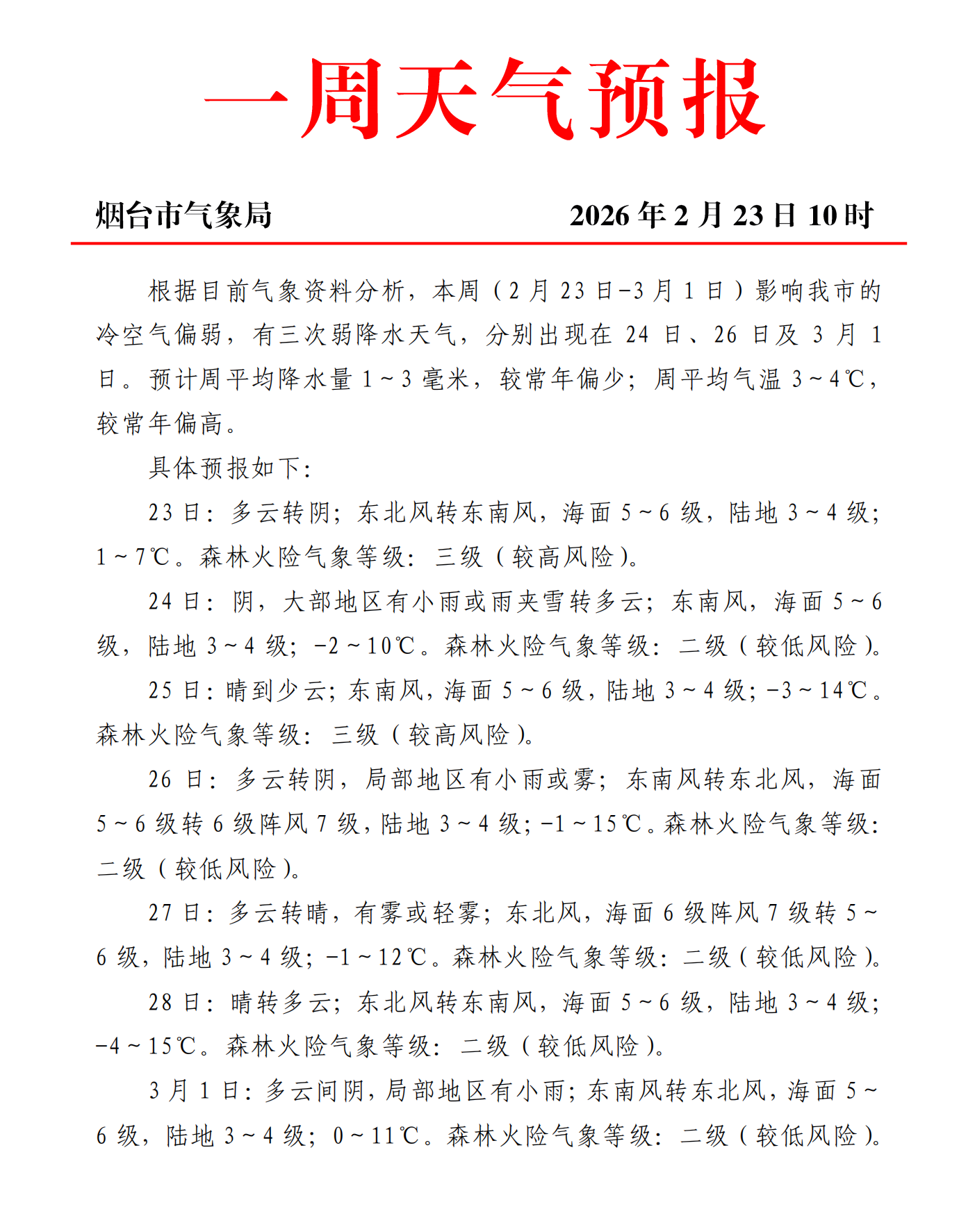 2月23日,烟台市气象局发布最新一周天气预报。根据目前气象资料分析,本周(2月23日—3月1日)影响烟台市的冷空气偏弱,有三次弱降水天气,分别出现在24日、26日及3月1日。预计周平均降水量1~3毫米,较常年偏少;周平均气温3~4℃,较常年偏高。