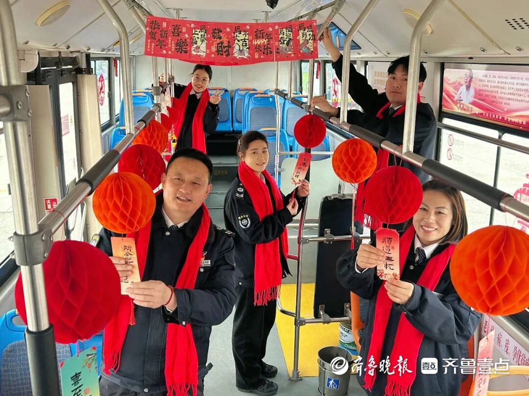 根据客流动态,烟台公交集团在火车站、毓璜顶庙会、植物园灯会等人流密集站点设立志愿服务岗,疏导车辆、引导候车、帮扶老幼群体,协同调度保障秩序。车厢内布置"喜迎新春""金马送福"主题装饰,悬挂灯笼福字营造节日氛围。驾驶员主动问候乘客,以细节提升出行幸福感。