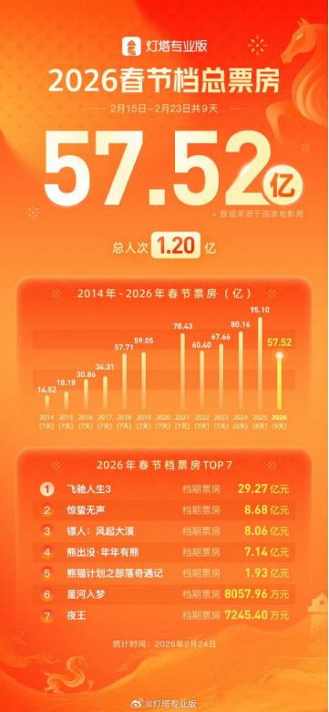据国家电影局数据,截至2月24日9时,2026年春节档总票房达57.52亿元,观影人次1.20亿,《飞驰人生3》成为春节档票房冠军。作为年度电影市场的“开年风向标”,本次春节档影片题材丰富、类型多元,形成头部领跑、黑马突围的市场格局。