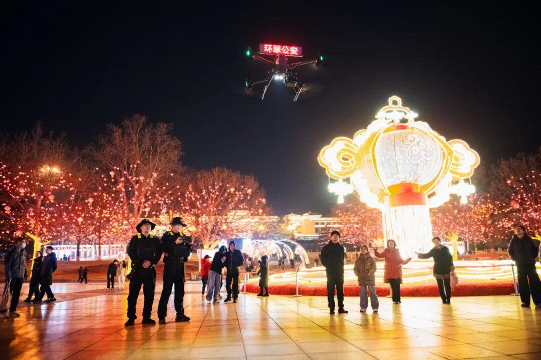 在热闹的人群上空,守护是“无声”的。春节期间,威海环翠区属相街、华夏城、大相框、威高广场等热门景点及商圈人流如织。市民游客或许不曾留意,一架警用无人机正静静悬停,用高清镜头俯瞰着熙攘人群,实时画面同步传回低空警务专班的指挥屏幕。“请您照看好老人和孩子,有序通行……”无人机上搭载的扩音器循环播放着温馨提醒。