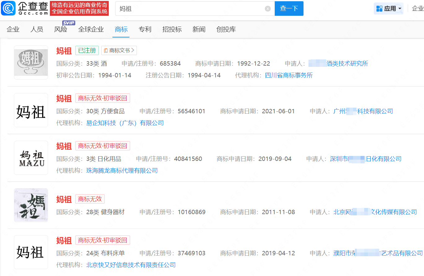 企查查APP显示,目前已有多家主体申请注册“妈祖”商标,申请人包括广州某科技有限公司、深圳市某日化有限公司等,国际分类涉及酒、方便食品、健身器材等,其中部分商标已成功注册,多数商标状态为无效。