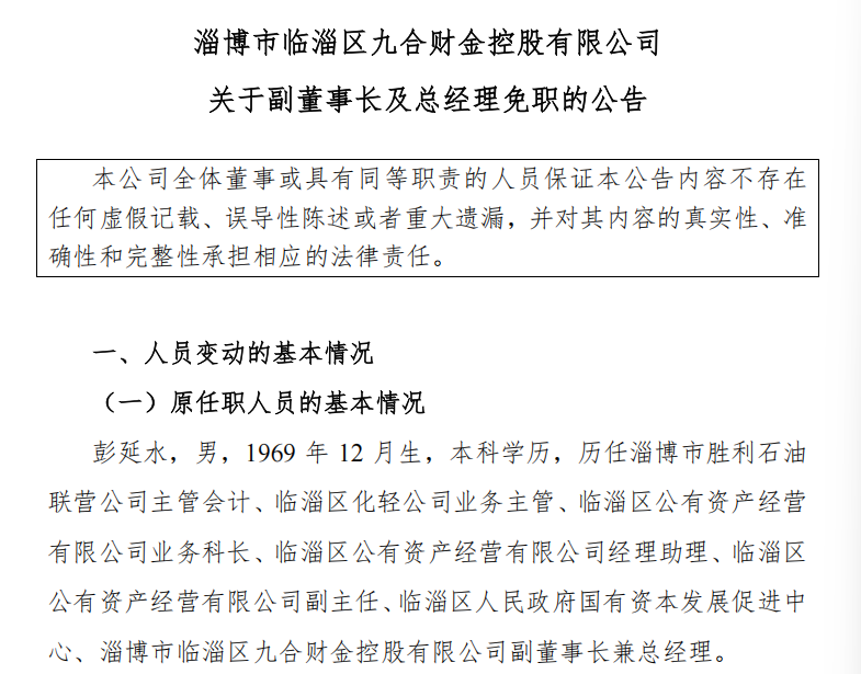 淄博九合财金控股副董事长、总经理彭延水被免职,岗位暂空