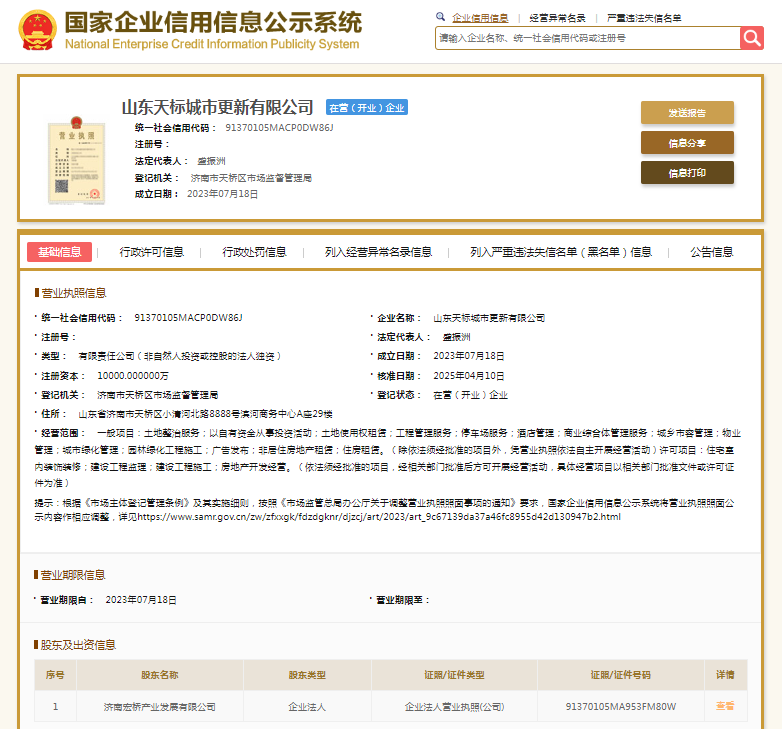 山东天标城市更新有限公司则成立于2023年,注册资本10000万元人民币,法定代表人为盛振洲,公司由济南宏桥产业发展有限公司全资持股。