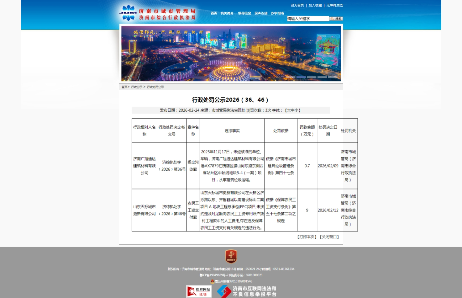 济综执处字﹝2026﹞第46号内容则显示,山东天标城市更新公司涉农民工工资支付案。违法事实显示,该公司在天桥区济泺路以东、齐鲁鞋城以南建设标山二期项目 A 地块工程总承包(EPC)项目,未按约定及时足额向农民工工资专用账户拨付工程款中的人工费用,存在违反保障农民工工资支付有关规定的违法行为。依据《保障农民工工资支付条例》第五十七条第二项之规定,处罚机关对其罚款9万元。