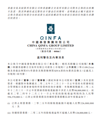 消息面上,2月23日,中国秦发发布公告,预计截至2025年12月31日止年度将录得除税后亏损不多于9800万元,而截至2024年12月31日止年度的除税后盈利约为5.56亿元。已终止经营业务的除税后亏损不超过2.26亿元,持续经营业务的除税后盈利不超过1.28亿元。
