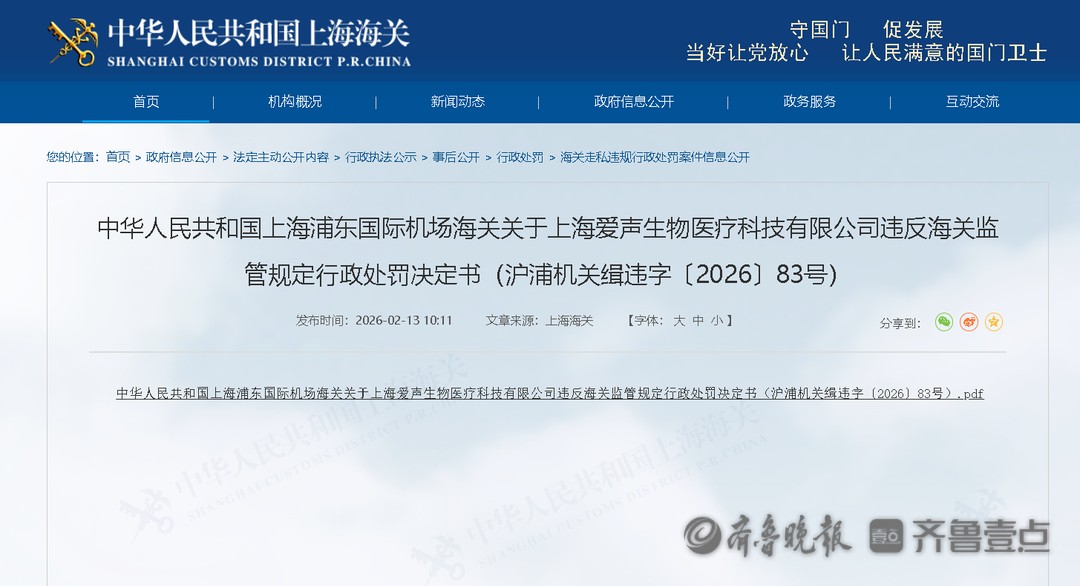 近日,中华人民共和国上海浦东国际机场海关发布关于上海爱声生物医疗科技有限公司违反海关监管规定行政处罚决定书(沪浦机关缉违字〔2026〕83号)。