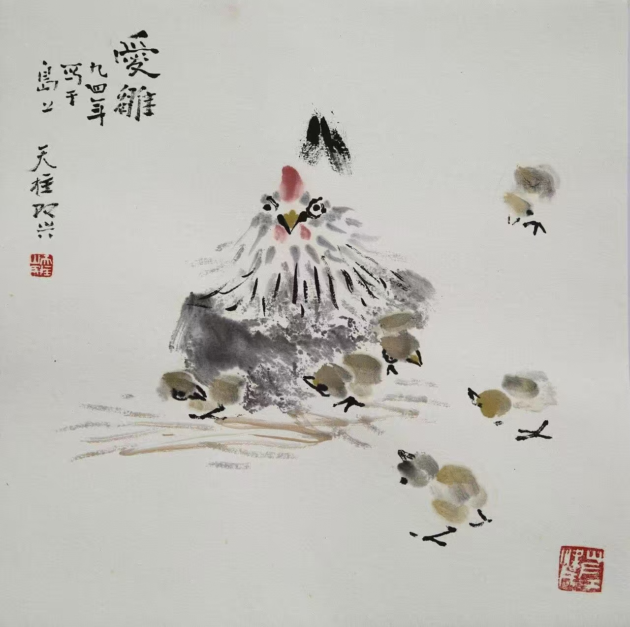 此次《艺术家宴》,展出梁天柱先生作品近50幅,除了一幅五六平尺的《峰回路转》外,都是一平尺半左右的小画,均为晚期作品也全是首次与公众见面,张张精美,幅幅绝伦,当下已很难寻觅到这样的绘画珍品。梁天柱先生1994年81岁时画的一幅《爱雏》小品,母鸡展开羽翼,将一群小鸡护在翼下,小鸡们探出身来东张西望,有的小鸡在母鸡身边吃食,稍远的几只小鸡边觅食边抬头看母鸡,亲情融融。梁天柱先生1996年中秋日于岛上海滨楼所作《黄河东流》,把黄河滚滚东流的雄伟气势刻画得淋漓尽致。配上梁天柱先生的自题诗给人以无限遐想:“黄河东流,长江也东流,流去不回首。古今多少英雄,逝者如斯夫,何叹谁是谁非。今朝明朝,瞬间已成过去,留得后人评说述旧。”