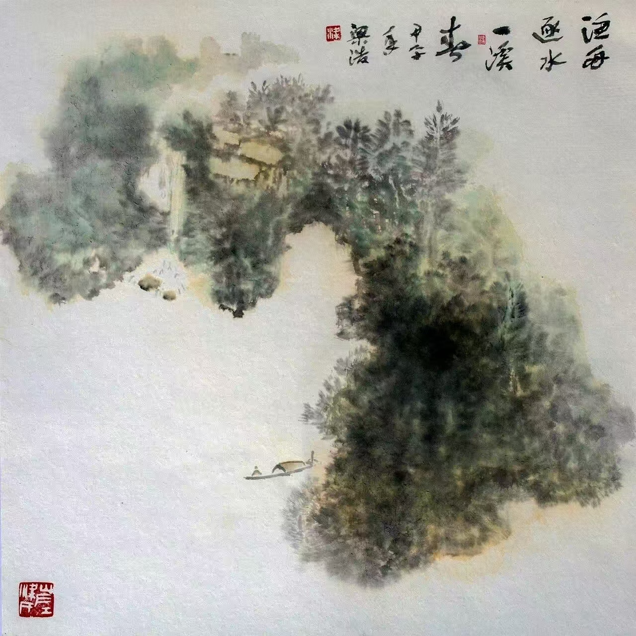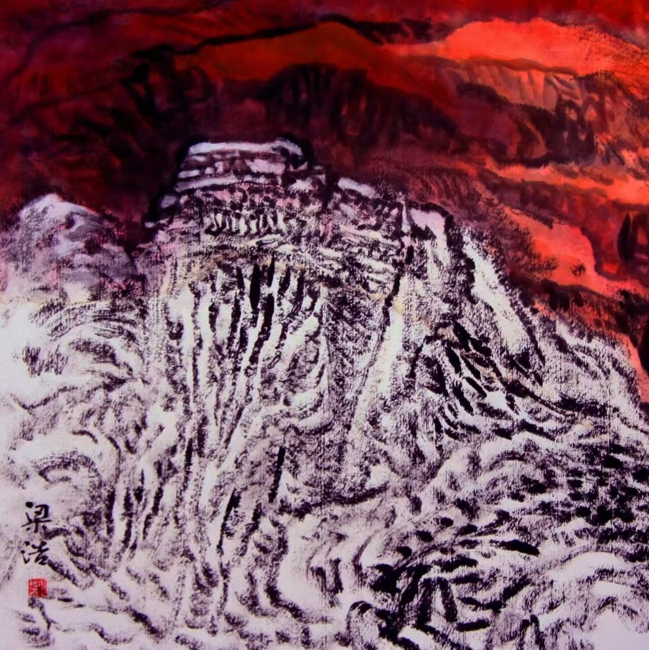 梁浩的山水画有中西合璧之长,西方绘画的透视原理和用光手段应用得心应手,西方印象派、抽象派的视觉追求能在梁浩画作中再造。梁浩笔下的山川河流、云起云飞、西风斜阳、寒江明月,以及自然界的宇宙黑洞、龙卷风暴等自然天象,都成了他拓宽画域的天地。中国的著名山水画大师、大家层出不穷,可以说是高山林立。近代的黄宾虹、李可染、傅抱石、张大千、林风眠,当代的赵无极、朱德群、贾又福等,都让人仰止。梁天柱先生也是其中不可或缺的一员。作为梁天柱先生长孙的梁浩,义不容辞地成为传承梁天柱先生绘画艺术的中坚力量,他的目标是打造心中的山水画殿堂。他决心与小姑梁凌娟、小姑夫梁平齐心协力,与社会各界联手,把天柱画派的“艺术家宴”打造成“艺术盛宴”。