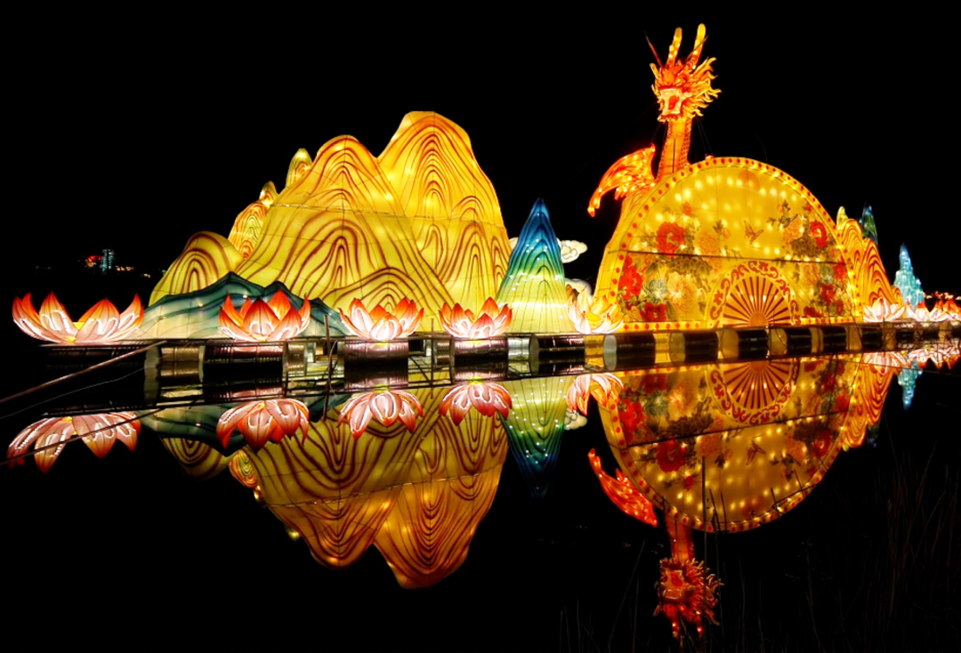 22米的“超级水上飞龙”盘踞于波光粼粼的水面,与倒影虚实相生,气势磅礴,引得游人纷纷驻足。