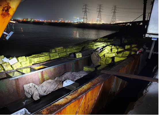 行动前,该局通过海洋智能态势感知系统研判线索,通过轨迹追踪、蹲点摸排等方式,全面掌握涉案船舶活动规律与上岸卸货时机,周密部署行动。行动中,海警执法员快速封锁码头出入口,同步登船检查与现场控制,当场锁定船名号为粤某渔XX号的涉案散货船。经现场清点,船上装载箱装鲜活夏贻贝、雪蛤等海产品100余吨,均无法提供合法凭证,涉嫌走私。案件正在进一步侦办中。