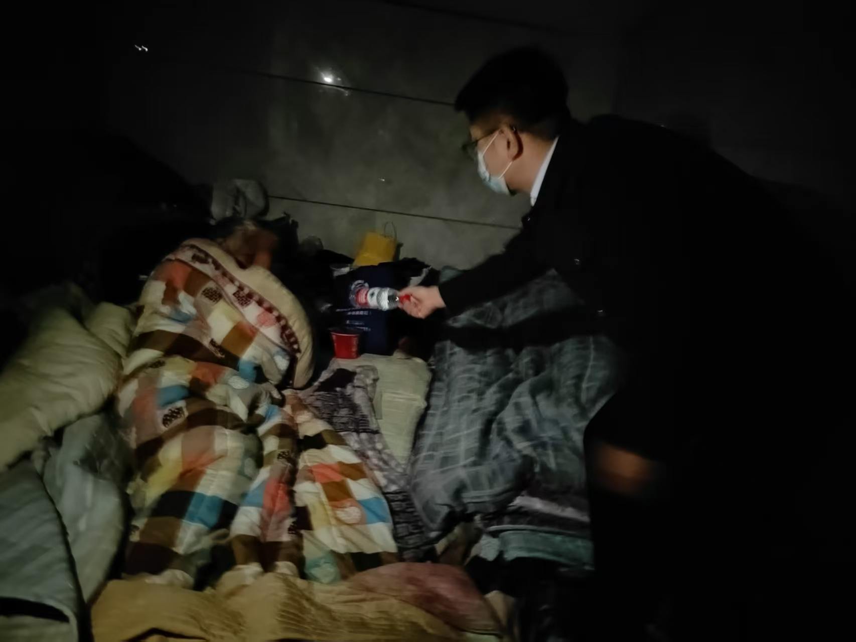 在巡查过程中,工作人员与志愿者耐心与疑似遇困人员沟通交流,细致了解其生活状况,积极劝导其前往服务中心接受专业救助;对于自愿放弃集中救助的人员,现场发放救助联系卡,清晰告知各类求助渠道,同时为其送上棉衣、棉鞋、棉被、保温壶等御寒保暖物资,筑牢困难群众过冬过节的安全温暖防线。