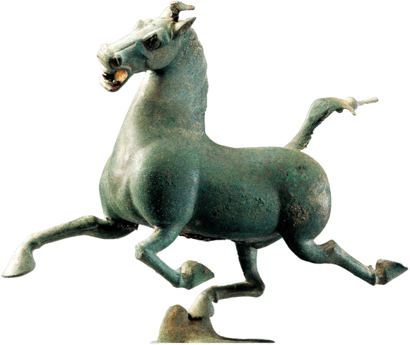 马的雕塑千姿百态。秦始皇陵出土的马俑,体型高大、神态逼真,宛如真马,仿佛一声令下便能驰骋而去。制作注重写实,身体比例协调,面容各异,或昂首威严,或低头温顺,或张嘴嘶鸣。甘肃省博物馆收藏的汉代铜奔马,又称“马踏飞燕”,同样名扬四海。这马作飞驰状,四蹄翻腾、张口嘶鸣,姿态矫健、气势磅礴,最绝妙的是右后蹄踏在疾速飞行的燕子背上。燕子展翅倾斜,似被奔马踏中,而奔马凭一蹄稳稳站立,尽显平衡之美和精湛工艺。