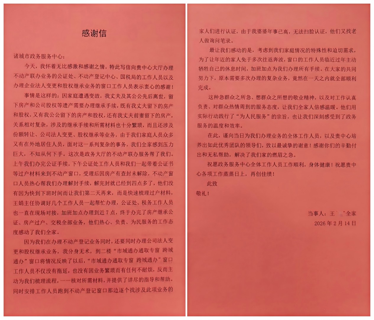 “原本需要多次办理的复杂业务,竟然在一天之内就全部顺利完成,他们用实际行动践行了全心全意为人民服务的根本宗旨!”2月24日,春节后上班第一天,诸城市政务服务中心收到一封情真意切的感谢信。市民王女士全家为窗口工作人员的高效暖心服务,竖起了大拇指。