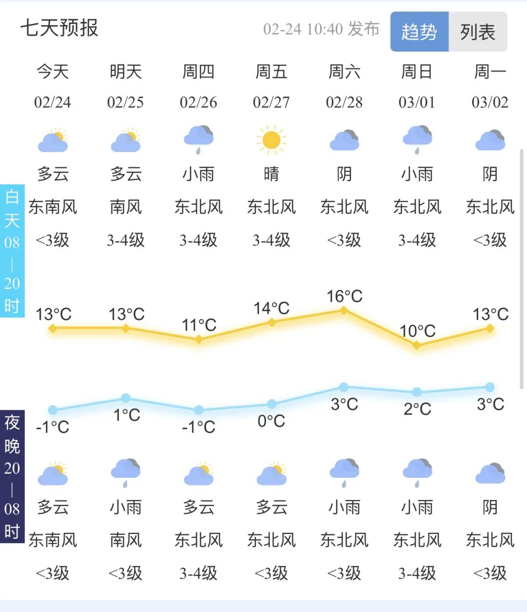 25日白天到夜间,全省天气多云转阴,聊城、泰安和鲁南地区有小雨。南风,鲁西北和北部沿海地区4级阵风5~6级,其他地区3~4级。夜间最低气温:鲁中山区和半岛内陆地区-1℃左右,其他地区3℃左右。最高气温:临沂、日照、鲁中山区和南部沿海地区10℃左右,其他地区14℃左右。