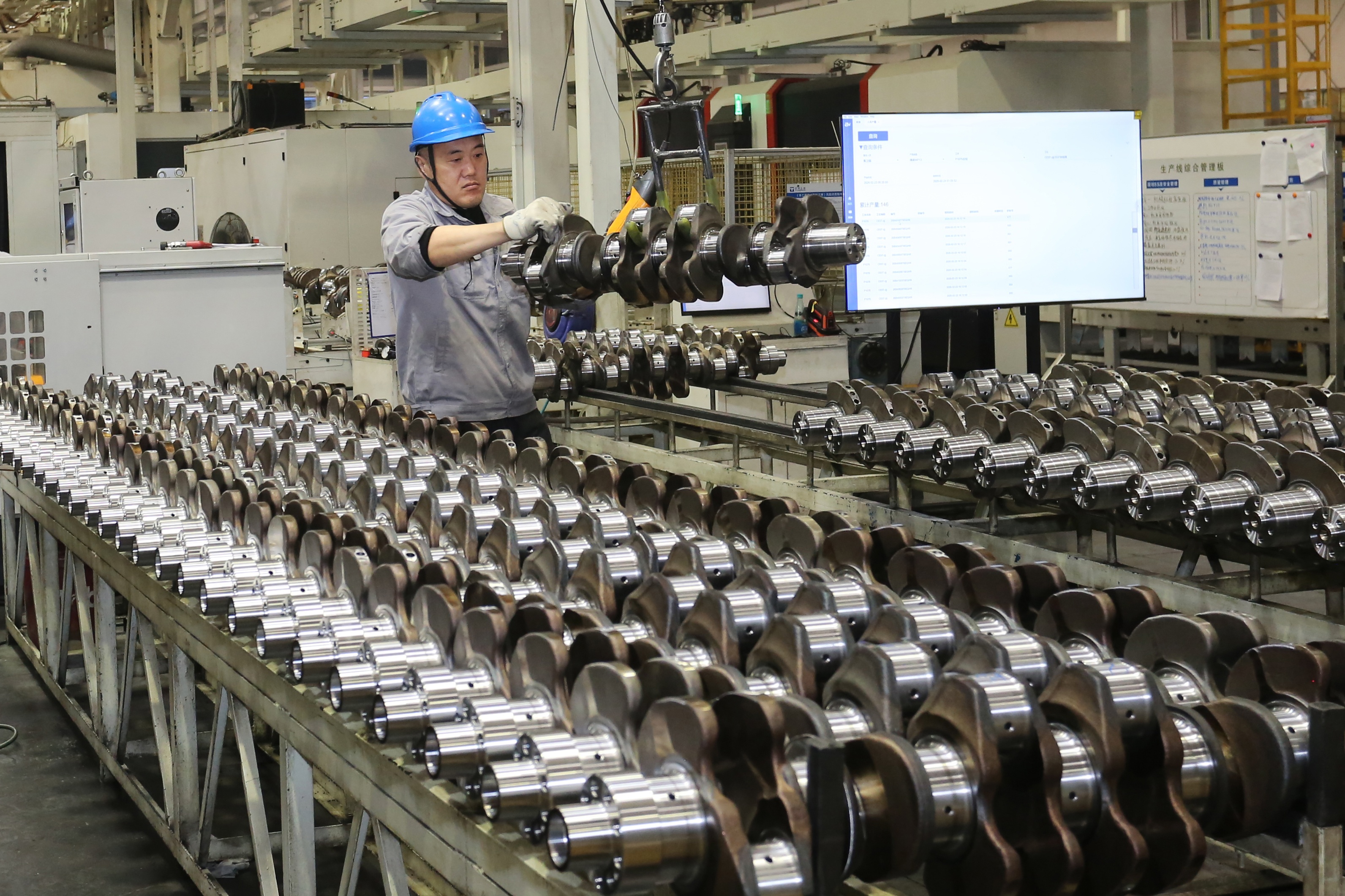 2月24日,工人在天润工业曲轴智能制造事业部生产车间内检验产品。当日是马年春节假期后首个工作日,威海市文登区的工业企业复工复产,各条生产线马力全开,冲刺首季“开门红”。(大众新闻记者陶相银通讯员陈宏青郭彦成)