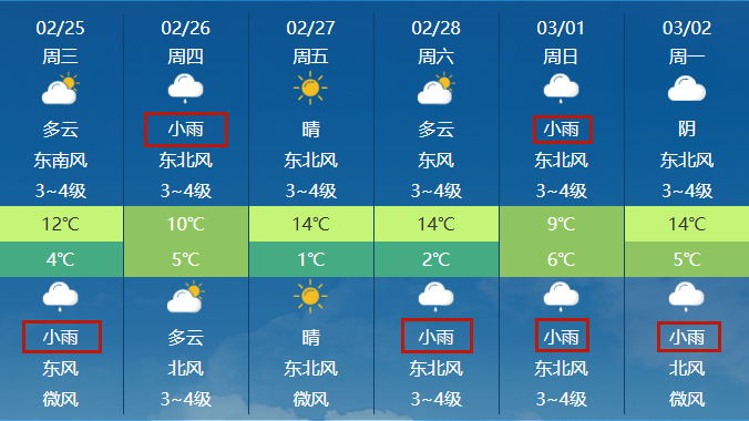 25日夜间到26日白天,多云转阴,有小雨,东南风转东北风3~4级,气温4~8℃;