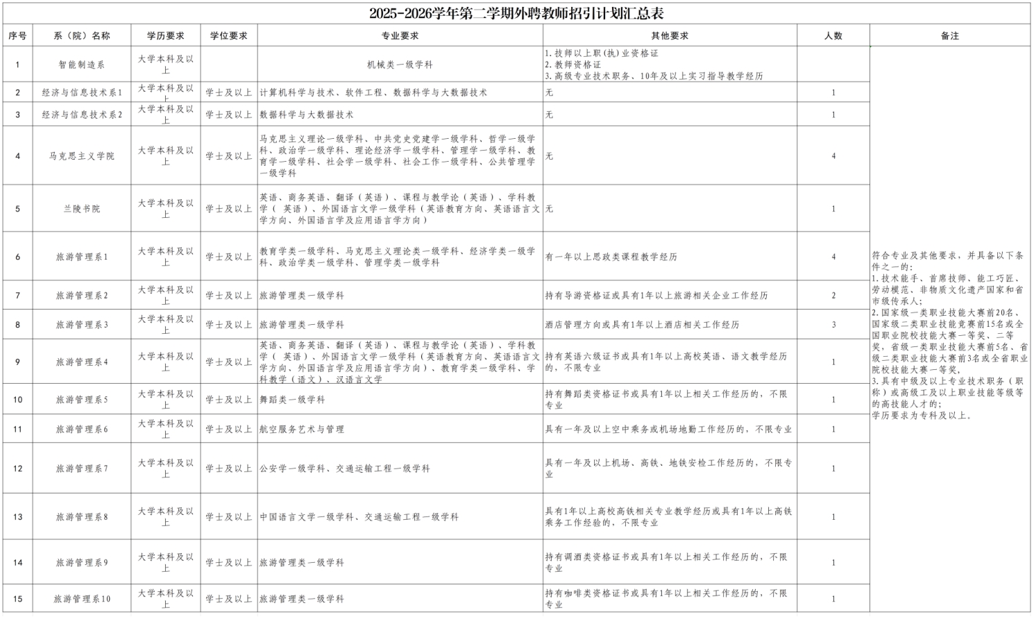 详见《2025-2026学年第二学期外聘教师招引计划汇总表》(附件1)。
