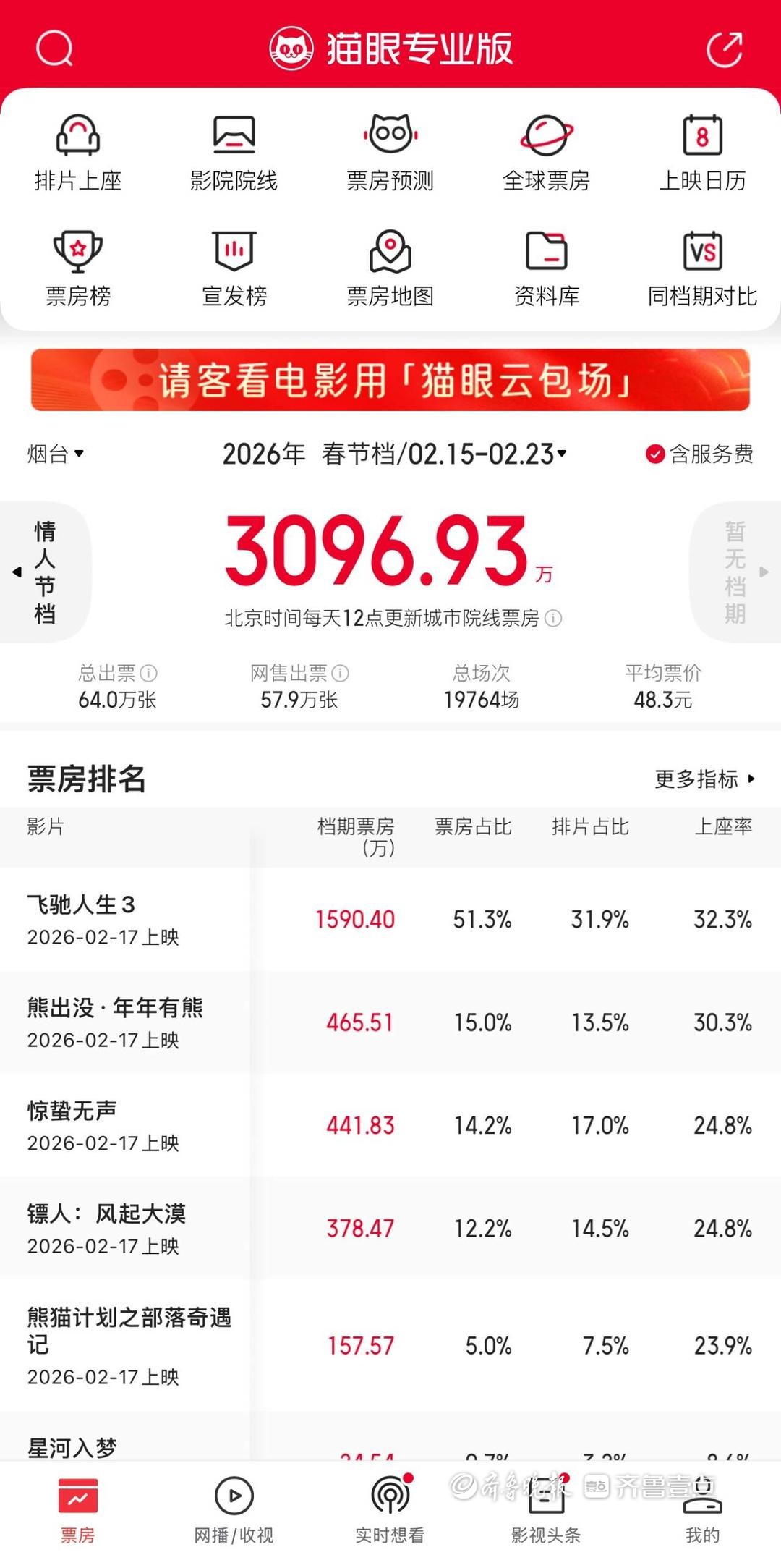 今年烟台春节档电影票房达3096.93万元(图源:猫眼专业版数据)