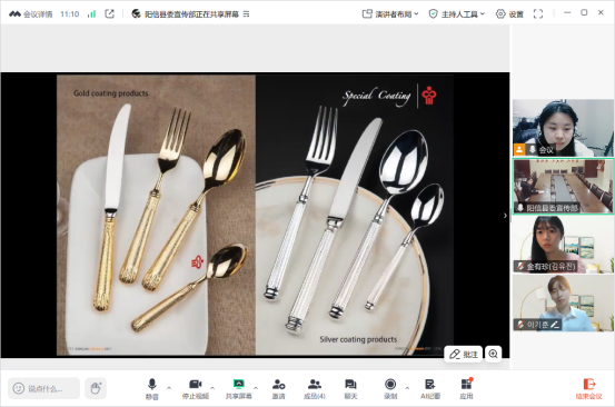 作为阳信不锈钢餐具代表企业,新东进餐具(阳信)有限公司在交流中通过屏幕共享,详细展示了产品从设计研发到生产制造的全流程,重点介绍了针对餐饮企业定制化需求的解决方案,包括材质选择、工艺标准及个性化外观设计等内容。