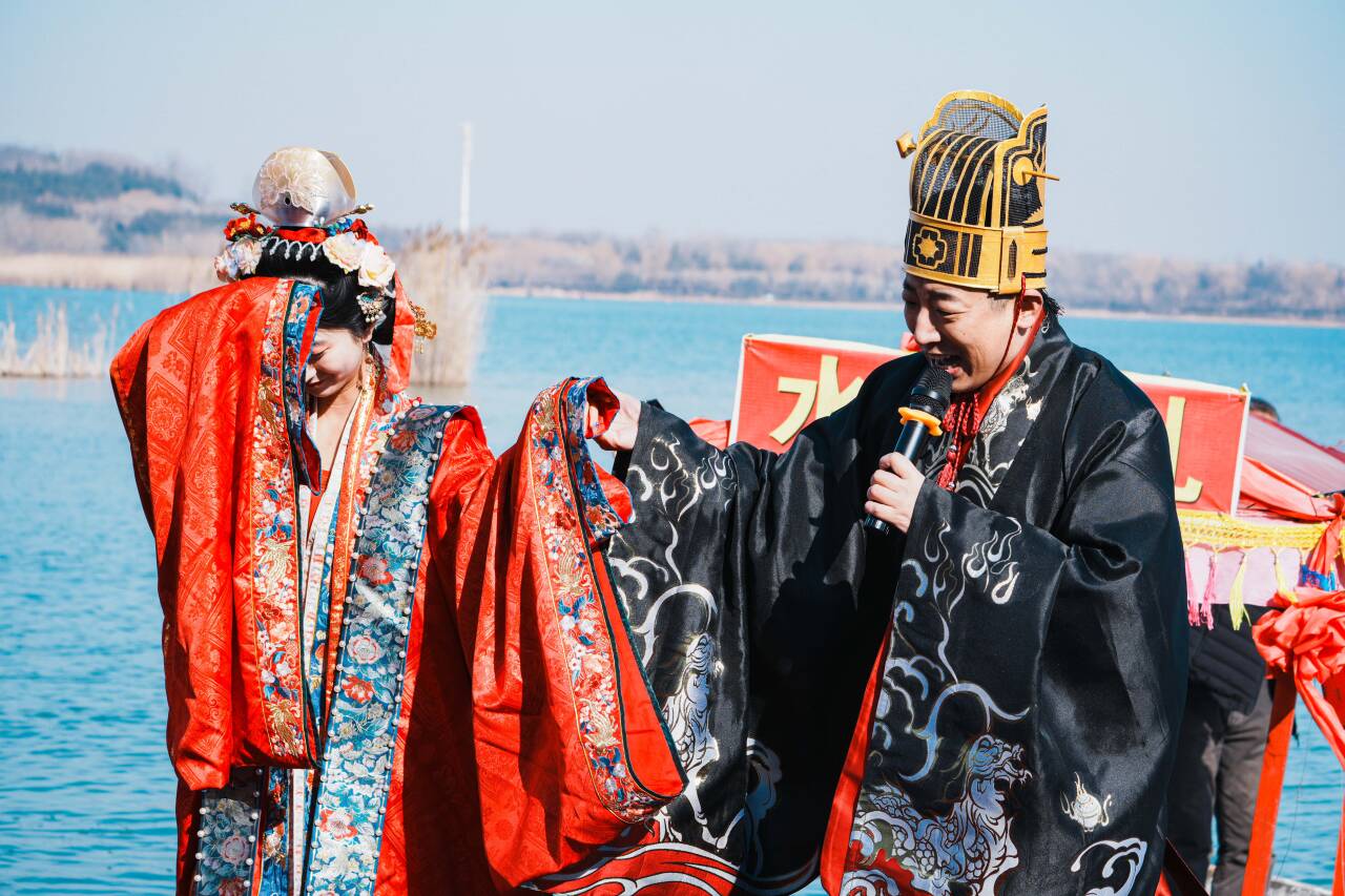活动期间,马踏湖结合水乡文化特色,重点打造渔家女、渔家翁等特色水乡NPC,通过沉浸式演艺还原湖乡生活场景。其中,水上婚礼演艺以湖为台、以船为媒,还原古代湖区婚俗的庄重浪漫;鱼鹰捕鱼演绎再现千年渔猎文化精髓,渔家翁现场展示技艺、讲解渊源,实现了文化传播与游客体验的双向提升。据悉,所有演艺均由当地非遗传承人与专业团队联合打造,旨在通过“活态传承”让传统文化焕发新生机。