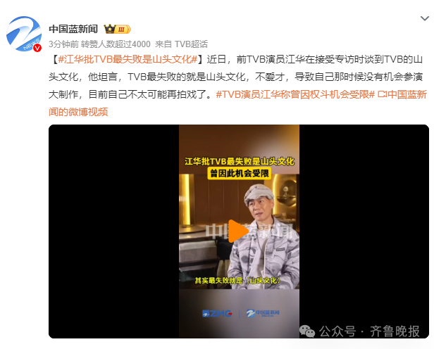 此前,江华在接受专访时谈到TVB的山头文化。他坦言,TVB最失败的就是山头文化,不爱才,导致自己那时候没有机会参演大制作,目前自己不太可能再拍戏了。