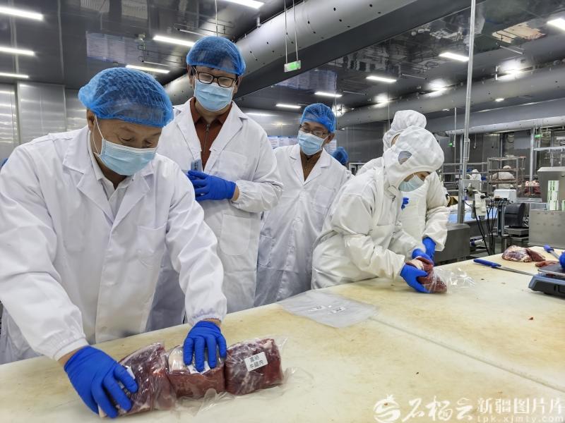 春节假期,朱廷新(左一)带着深圳客商在生产加工车间参观刚上市的富硒褐牛肉。石榴云/新疆日报记者 马帛宇 摄