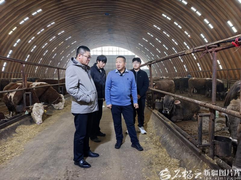 2月4日,朱廷新(右二)带着新疆畜牧科学院的专家和实习生在牛圈里查看牛的长势。石榴云/新疆日报记者 马帛宇 摄
