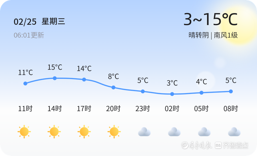 今天是2月25日,星期三,农历正月初九。淄博市今天天气晴转阴,气温在3℃至15℃之间,南风1级,空气湿度75%,PM2.5浓度为62,空气质量状况为良。早晨气温较低,可能出现霜冻,建议市民出行时注意防寒保暖。由于天气转阴,能见度有所降低,驾车出行请保持车距,确保行车安全。