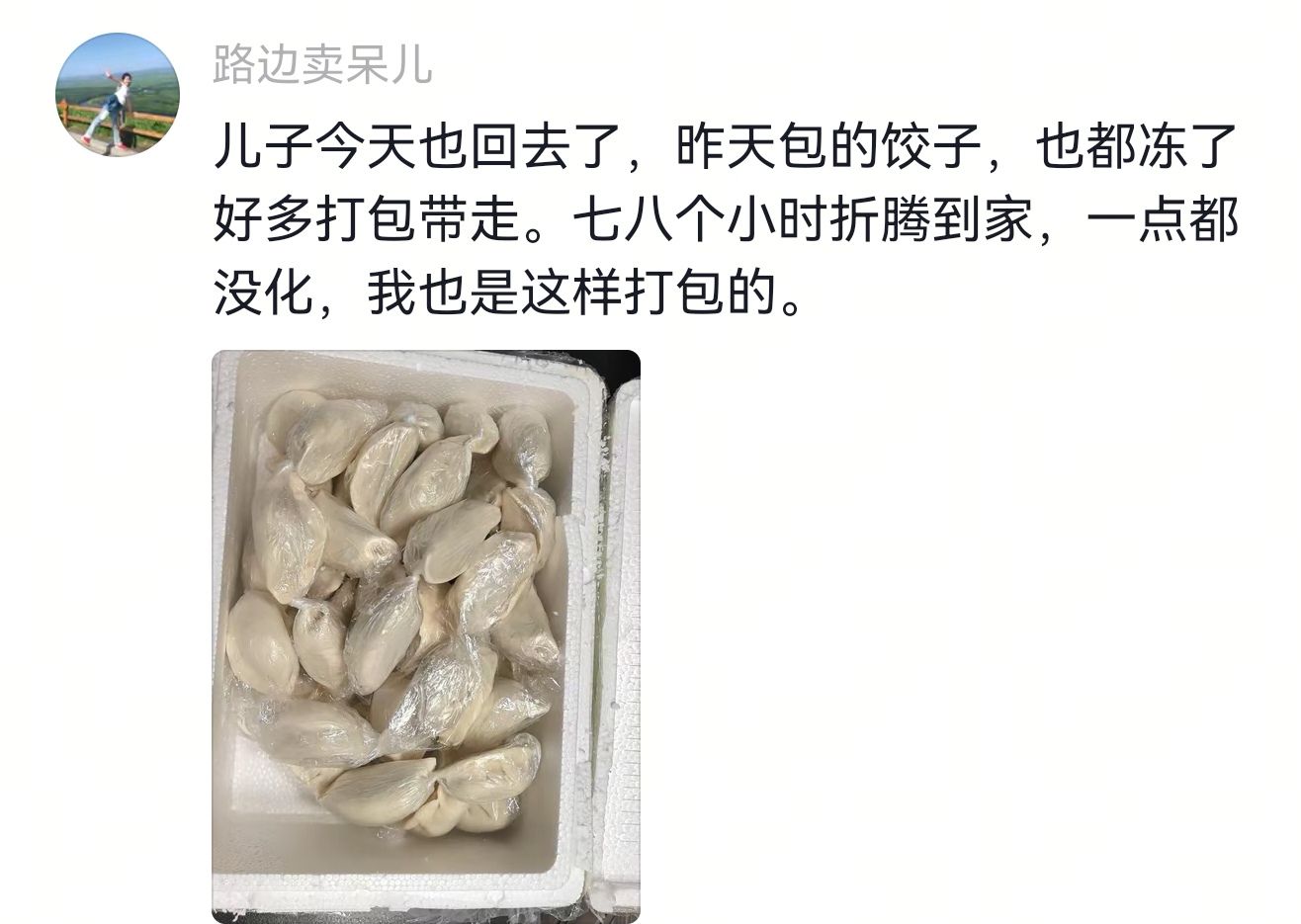 陈女士发布的视频也引起了网友们的共情,不少网友在评论区晒出饺子图片。有网友表示自己也是每个饺子单独打包:“儿子今天也回去了,昨天包的饺子,也都冻了好多打包带走。七八个小时折腾到家,一点都没化”。