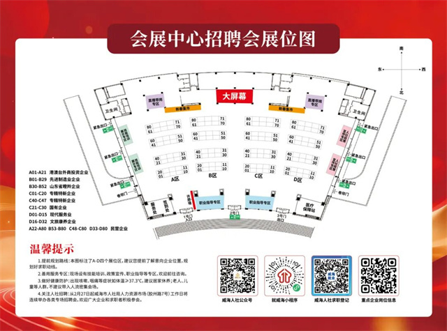 线上招聘专区将同步登录威海市就业服务平台(https://rsjjyfw.weihai.cn/zhaopin/home)及“就威海”微信小程序,参与线上招聘的企业将超500家。同时,由市人社局、市电视台及多家人力资源机构工作人员组成的带岗主播团,将在现场同步开展直播带岗活动。