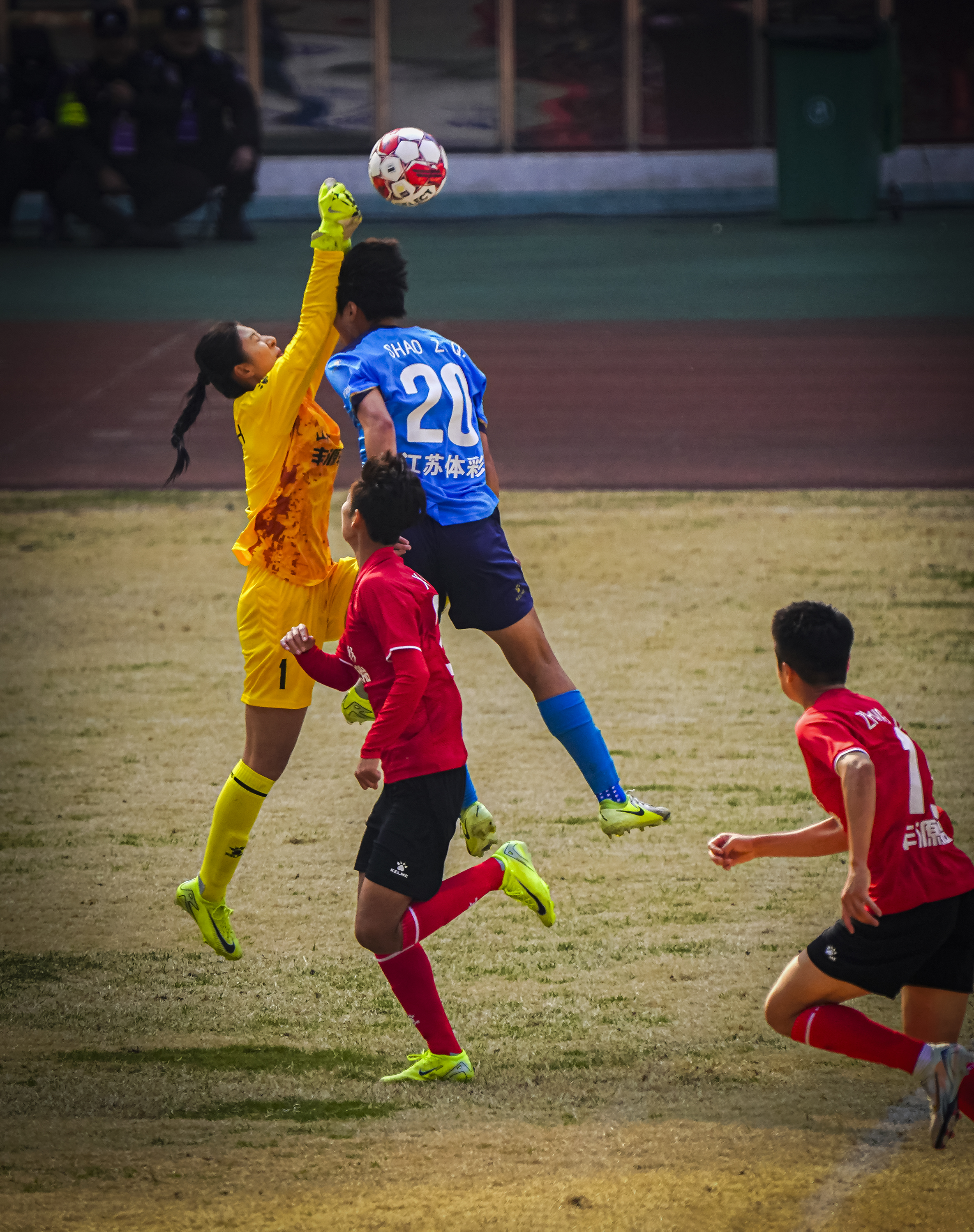 作品介绍:作品拍摄内容为女子足球比赛现场,双方精彩场面层出不穷,门前激战险象环生,守门员救险似猛虎扑食化险为夷。