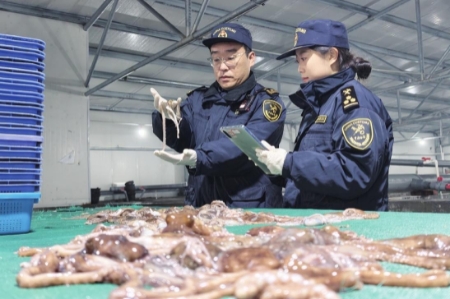 查验现场,一箱箱活章鱼、一袋袋活扇贝整齐码放,等待查验。“王科长,这批活鲜是专供海外春节市场的,客户对时效和成活率要求极高,就盼着能尽快通关放行。”烟台景伟水产有限公司总经理刘伟手持检疫申报单、供货证明等全套材料快步迎上。王明亮接过单据后,认真核对单证信息,同步调取系统内检疫要求指令并细致比对。他用指尖轻触查验章鱼的活跃度与体表健康状况,又逐袋翻看扇贝。经快速规范查验,这批活章鱼、活扇贝均被确认健康无疫、各项指标合格。货物即刻放行,为鲜活水产抢出最佳出运时间。
