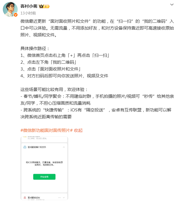 2月24日,微信员工@客村小蒋发文称,微信最近更新“面对面收照片和文件”的功能,在“扫一扫”的“我的二维码”入口中可以体验。无需流量,不用添加好友,和对方设备保持靠近即可接收原始照片、视频和文件。网友评论:(齐鲁晚报·齐鲁壹点客户端编辑武秀英综合网友评论、@客村小蒋微博)