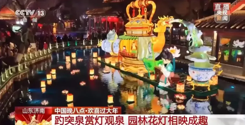 《东方时空》用5分钟直播展示天下第一泉夜游魅力:“一河连三景,一灯映千年”,画舫上乐师奏乐,泉水化作流动的文化星河。央视多档栏目连续四天聚焦济南,花灯会、文创“马彪彪”、柳子戏、明湖市集轮番亮相。