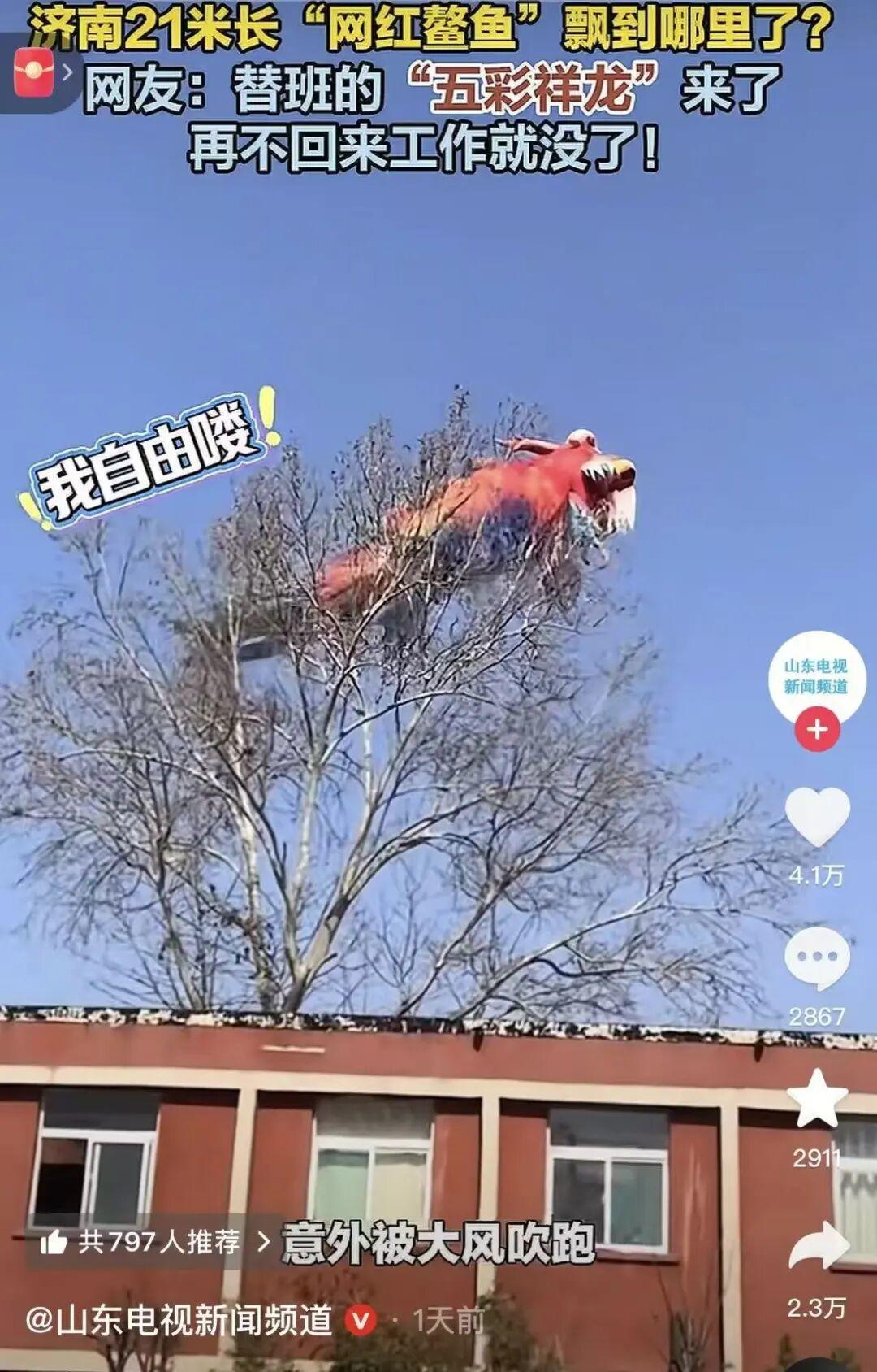 大年初四,济南上新街的一条“鳌鱼”火了!这只长21米、高7米的巨型空飘鳌鱼,原本只是静静地悬浮在广场上,承载着“独占鳌头”的美好寓意,供市民游客打卡观赏。然而,一阵大风过后,它挣脱绳索、“潇洒出走”的戏剧性一幕,演变成了一场持续数日的全民“寻宝游戏”和城市狂欢。
