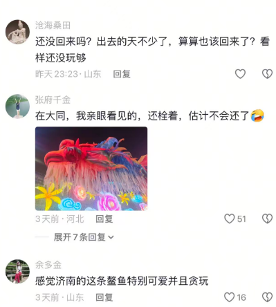 随着事件升温,一场“全城找鳌鱼”的行动自发展开。网友们自发成为“目击者”和“情报员”,在社交媒体上接力式地更新“实时坐标”:“看到它往西边去了!”“飞来我们南山了!”甚至有人调侃“是不是去趵突泉找‘猪鲤’串门了?”