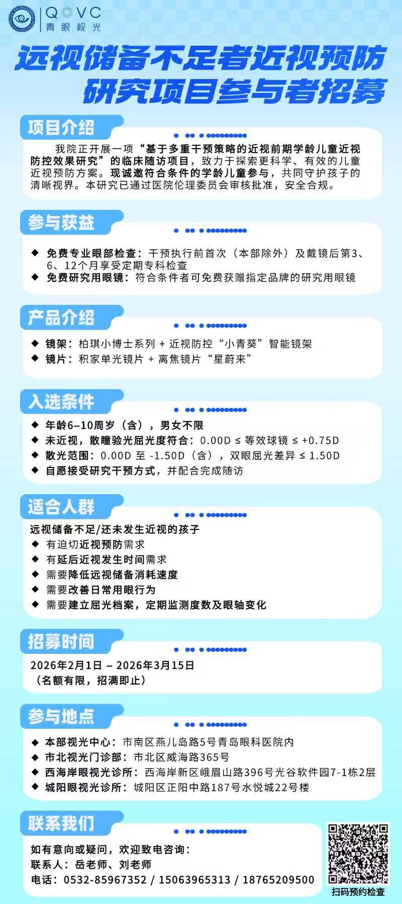 孩子远视储备告急?青岛眼科医院近视预防研究正在免费招募!