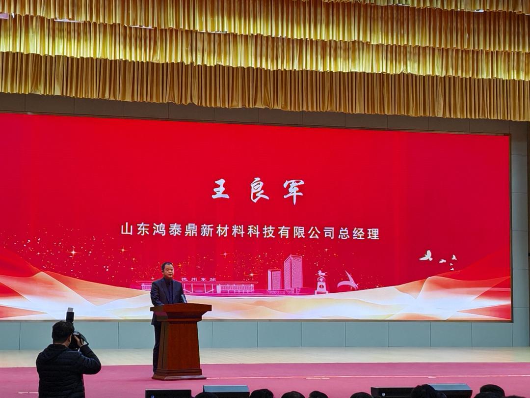 在会上,山东鸿泰鼎新材料科技有限公司总经理王良军介绍,2019年,公司落地夏津以来,德州市委市政府、夏津县委县政府始终高度重视企业发展,相关部门深人一线现场办公、靠前服务,为企业搭建了干事创业的广阔平台。企业先后获得"国家级高新技术企业""山东省单项冠军企业""山东省瞪羚企业"等称号。目前,第二条5万吨生产线已建成投产,总产能达到15万吨,位居全国第二位,2025年度完成产值6.9亿元。