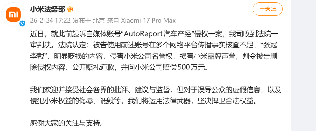 2月24日,小米法务部微博发文称,已收到法院一审判决,认定自媒体账号“AutoReport汽车产经”在多平台传播事实核查不足、“张冠李戴”、明显贬损的内容,侵犯小米公司名誉权,判令该账号运营方删除侵权内容、公开赔礼道歉,并向小米公司赔偿500万元。