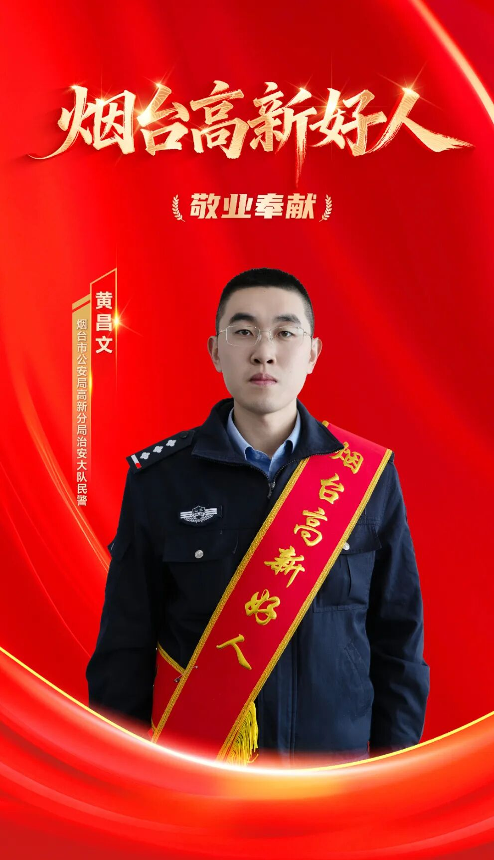 黄昌文,现任烟台市公安局高新分局治安大队民警。自投身公安事业以来,他始终恪守“对党忠诚、服务人民、执法公正、纪律严明”的总要求,以坚定的政治信念、深厚的为民情怀和过硬的业务本领,在平凡岗位上书写不凡答卷,用实际行动践行“人民公安为人民”的庄严承诺。