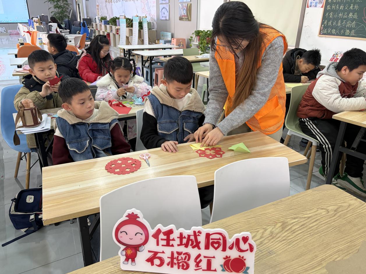 活动现场暖意融融,孩子们围坐在一起,在社区工作人员与志愿者的耐心指导下,纷纷拿起剪刀和彩纸,从折叠到剪刻,一步步学习传统剪纸技艺。巧手翻飞间,一张张普通的红纸变幻出丰富多彩的形态:既有象征吉祥如意的“福”字、窗花等传统纹样,也巧妙融入了民族文化元素。一件件充满童真与创意的剪纸作品渐渐诞生,孩子们的笑脸与手中的红色剪纸相映成趣。