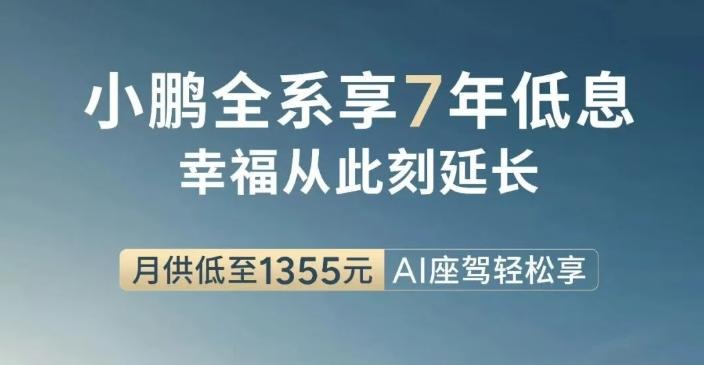 理想汽车则针对全系车型推出方案,L6、L7、L8、L9及i6等车型首付15%起(低至3.25万元),年化费率2.5%,月供2578元起;理想MEGA与i8享有专属权益,前3年免息、后4年年化费率2.5%,MEGA首付15.98万元起、i8首付9.98万元起,月供均低至2857元起,该方案为融资租赁产品,车辆所有权需还清贷款后过户。小鹏汽车于1月22日跟进,旗下MONA M03、P7+、G6等全系车型均可享受7年低息,首付最低15%,年化费率1.67%(折算年化利率3.18%),月供低至1355元,覆盖入门级至中高端多款车型,贴合其年轻化用户定位。
