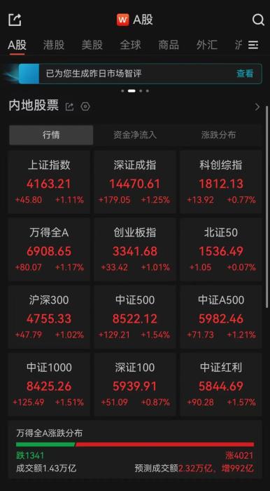25日,A股三大指数高开高走,截至发稿,沪指涨1.11%,深证成指涨1.25%,创业板指涨1.01%。全市超4000只个股上涨。
