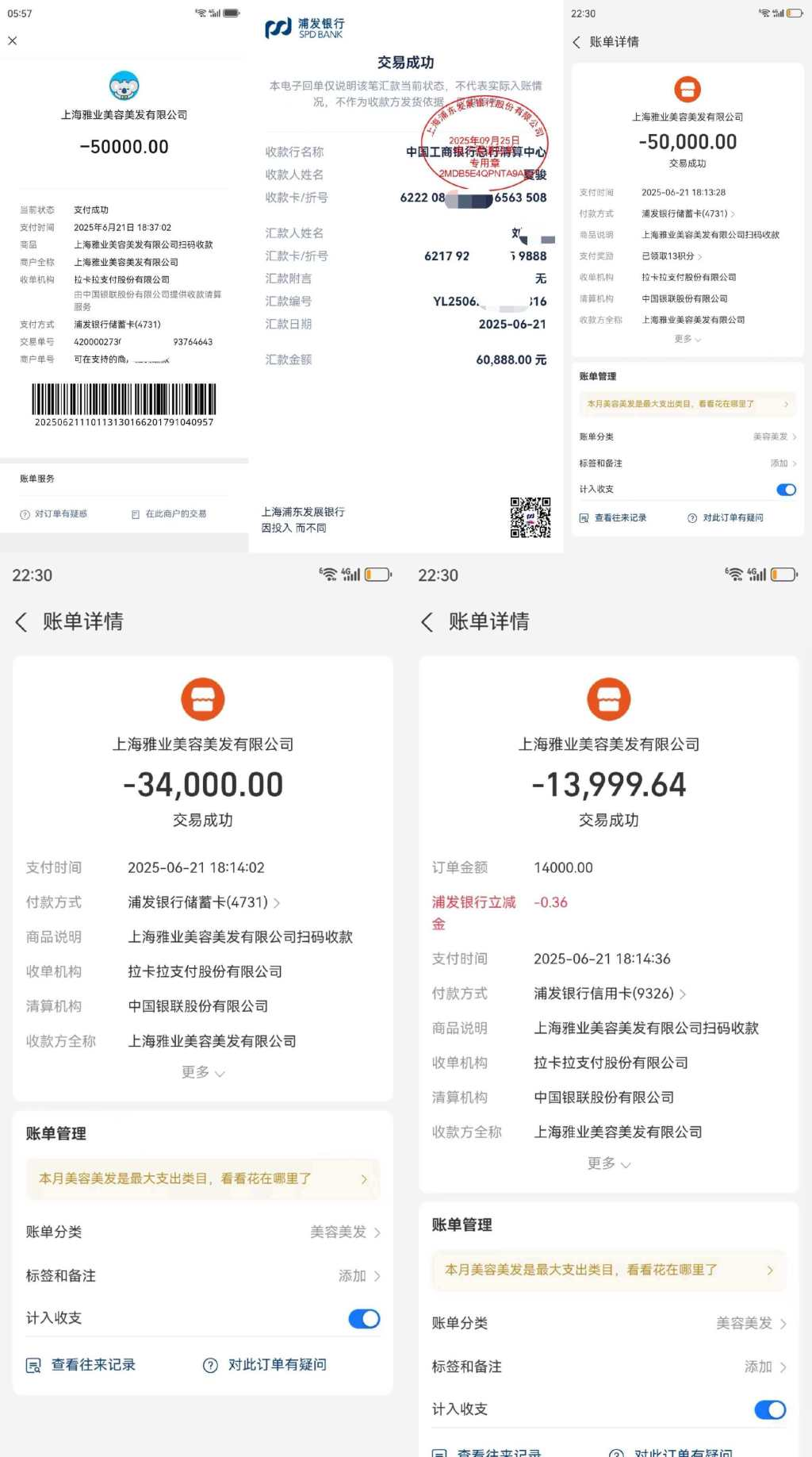 据刘女士提供的付款截图显示,她于当日通过花呗、储蓄卡等方式向该公司支付208888元,其余金额从自己充值的会员卡中扣除。刘女士补充道,当日购买完之后工作人员登记的项目名称为“青春定格术”,但后续自己于9月向上海市静安区市场监督管理局反映后,对方向市场监督管理局提供的价格表上显示的项目名称为“5D 3.0”。刘女士认为自己购买的项目名称前后不一,美容院已经侵犯了自己的知情权,她要求上海尚岚贸易有限公司第五分公司全额退款,但在多次沟通中均被拒绝。