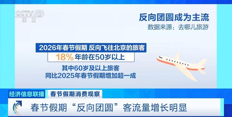 “反向团圆”从往年的小众选择升级为主流潮流,成为今年春节文旅市场的一大亮点。在大城市工作的年轻子女,接父母前往北上广深等一线城市过年。数据显示,2026年春节假期,反向飞往北京的旅客中,18%年龄在50岁以上,其中60岁及以上旅客同比2025年春节假期增加超一成。